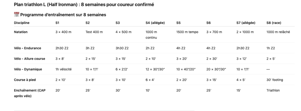Plan triathlon L (Half Ironman) : 8 semaines pour coureur confirmé