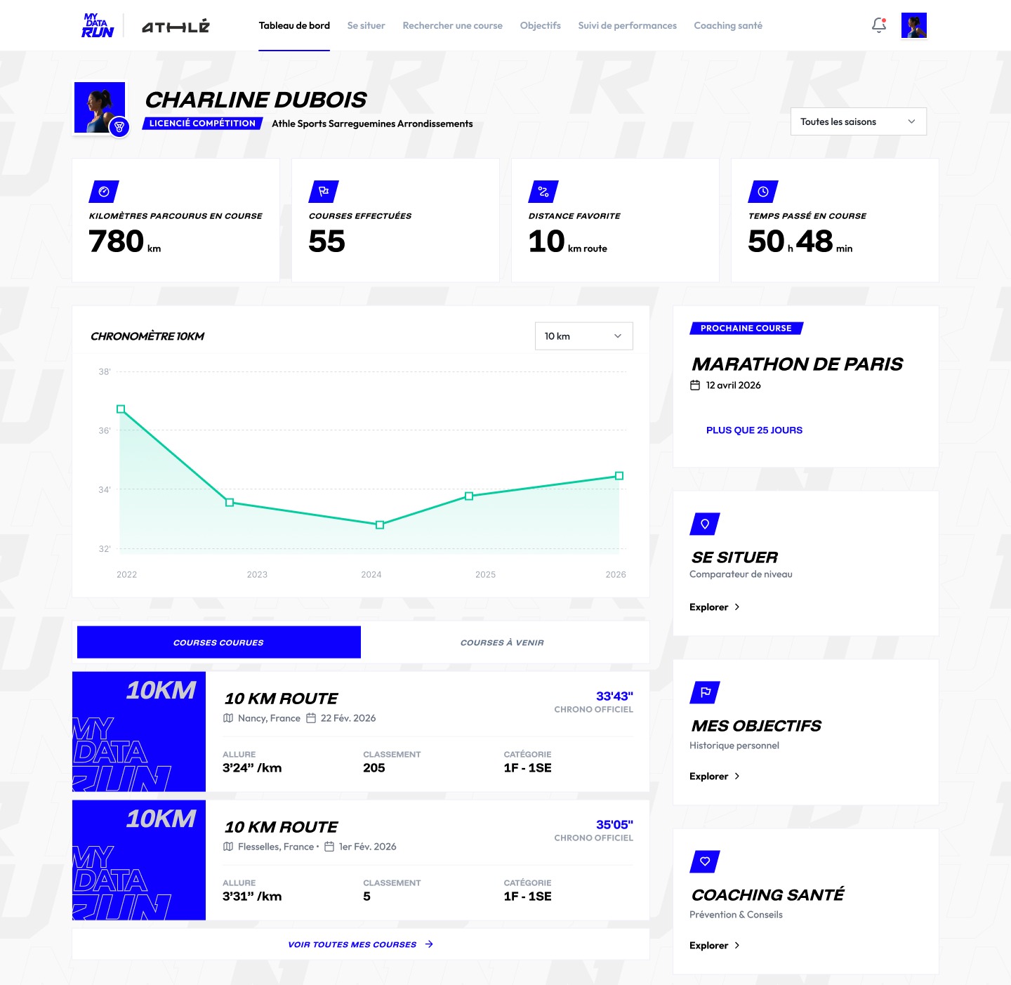 Prévue pour un lancement fin mai, MyDataRun s’appuie sur les données des courses labellisées par la FFA collectées depuis plus de vingt ans. L’outil permettra à chaque coureur de retrouver l’ensemble de ses résultats, d’analyser sa progression par distance, par période ou par lieu de course, et de se situer dans le temps.