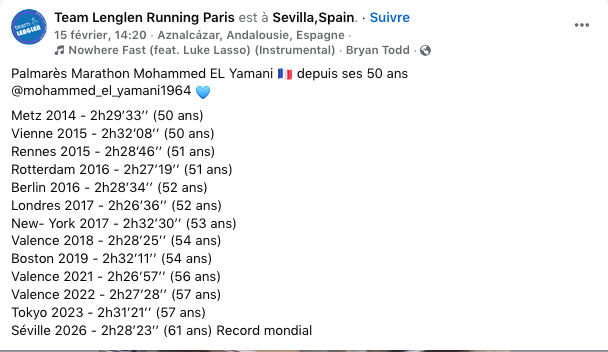 Il a attendu son heure, patiemment. Trois longues années sans marathon, freinées par une blessure tenace, avant de revenir là où on ne l’attendait plus : au sommet de l’athlétisme mondial masters. Le 15 février, au Marathon de Séville, Mohammed El Yamani a signé un retour spectaculaire en battant le record du monde du marathon M60 (60-64 ans).